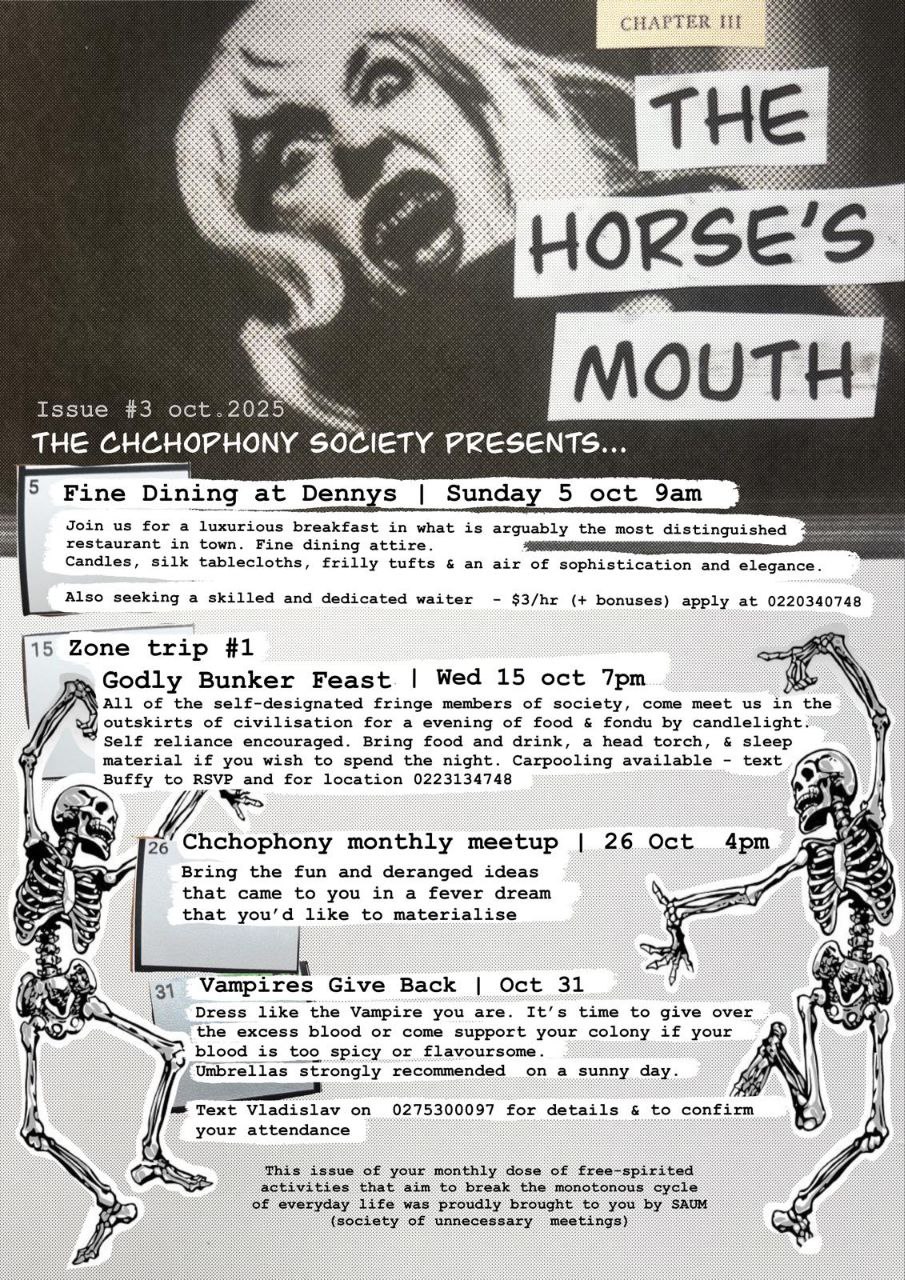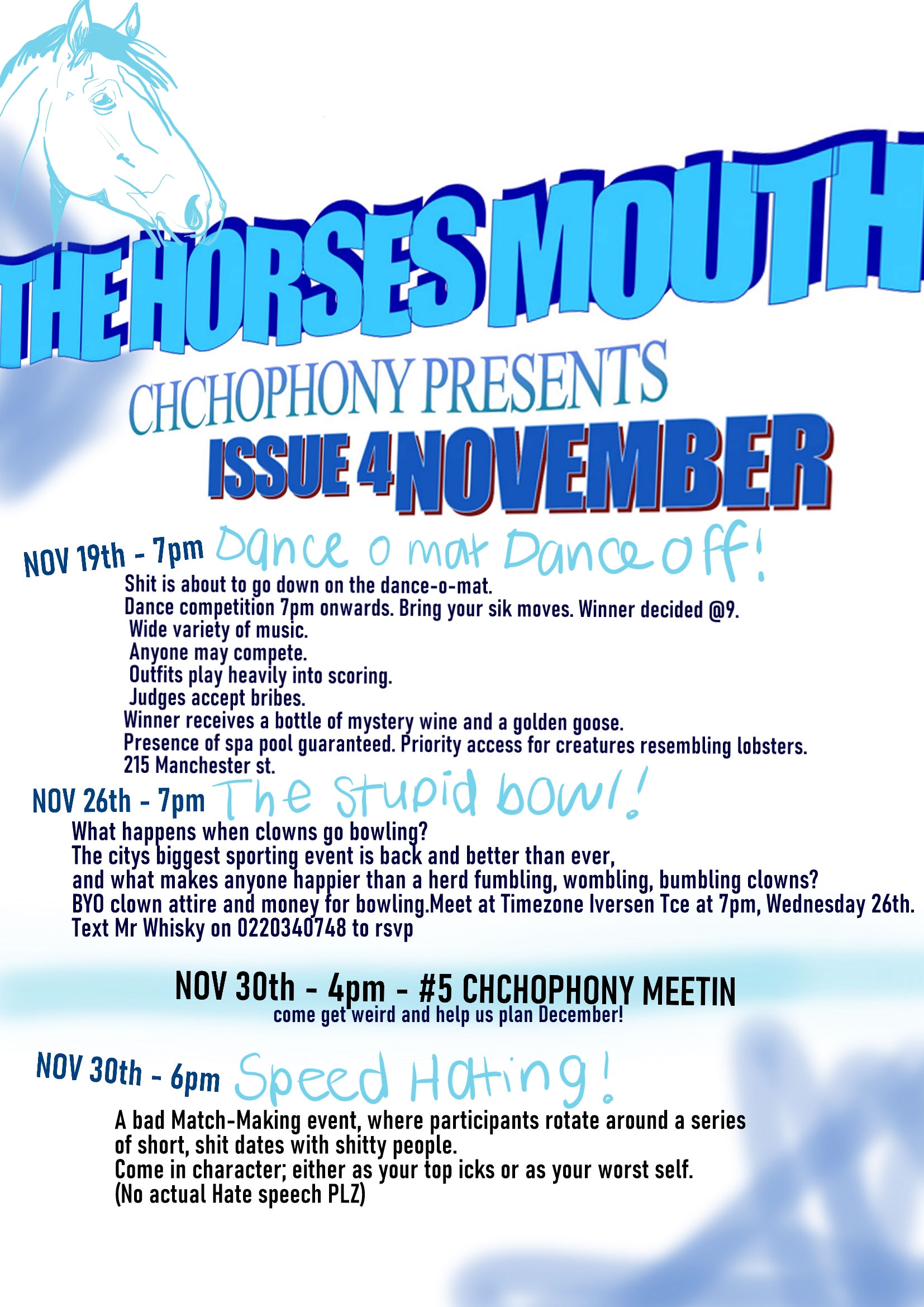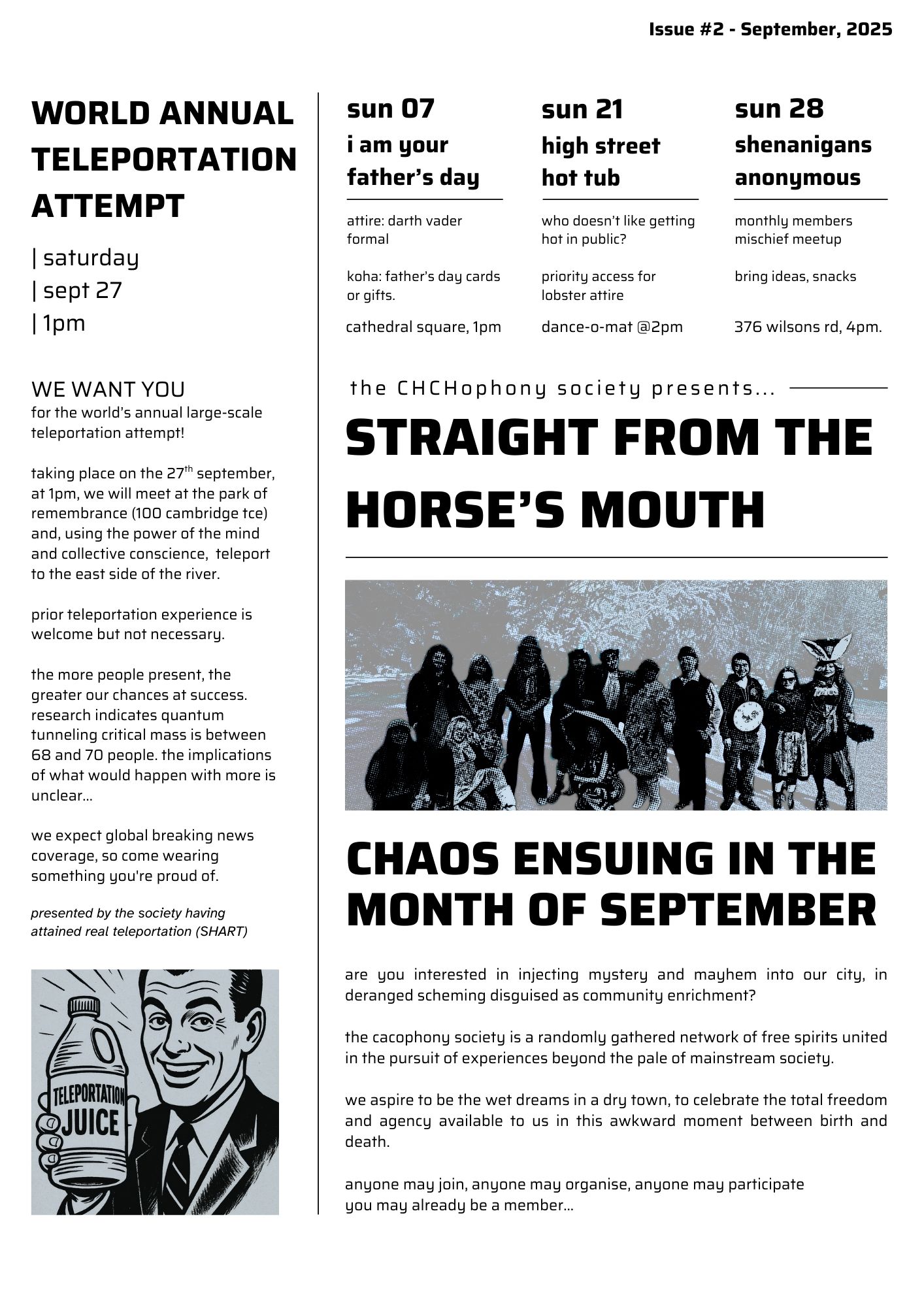 The Horse's Mouth serves as the voice of Chchophony Phase II, documenting the bloom of Cacophony in Ōtautahi and announcing upcoming adventures in absurdity.